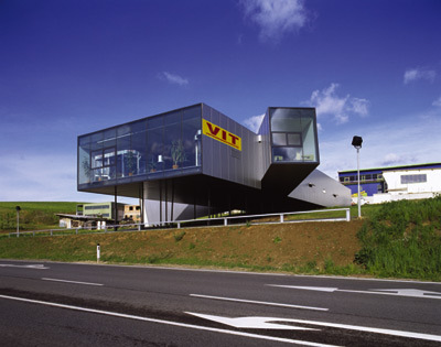 Die absurde Situation, dass ein Hanggrundstück als Gewerbebauland dienen soll, führt im Normalfall zu hohen Kosten. Zuerst muss der Hügel begradigt werden, dachten sich die Nachbarn und zogen monströse Stützmauern hoch. Oswald Vit aber war so clever, sich überzeugen zu lassen, dass die Terrassierung nicht nur die Landschaft vergewaltigt, sondern auch genauso teuer ist wie eine auf vielen kleinen Stützen stehende Röhre, die am höchsten Punkt des Hangs startet und dann gerade in den Raum hinausschießt. Die Röhre endet bei einer Höhe von sechs Metern über dem Boden mit einem großen Fenster, durch dass die Autofahrer für einen kurzen Moment die Wintergärten sehen können. Besucher gelangen durch eine Art Rüssel, den der Bau nach unten streckt, über eine lange Treppe in den Showroom hinein. Schmuckloser kann man es sich kaum vorstellen und setzt schon zur Frage an, ob der Eingang denn nicht zu sehr am Geschmack der Leser von Architekturzeitschriften ausgerichtet sei. Da gibt Vit, dessen Büro im zweiten, nach oben gerichteten Rüssel untergebracht ist, eine entwaffnende Erklärung. Zu viele sollten ja gar nicht heraufkommen, die nur durchs Gebäude neugierig geworden sind, dann wär' bloß eine Beratung ohne Geschäftsaussicht fällig, und seine Leut' sollten sich ja auf die echten Kunden konzentrieren.