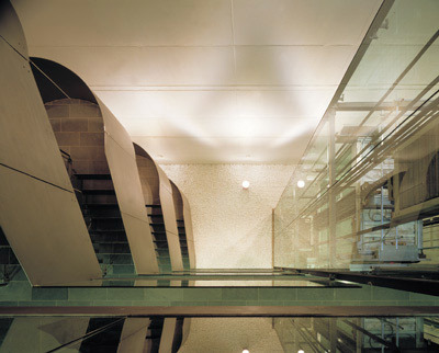 Von der Tiefgarage heißt es angeblich, sie sei die einzige „bewohnbare Tiefgarage Europas“. Das klingt hoch gegriffen, falsch ist es sicher nicht. Auch wenn Szyszkowitz und Kowalski betonen, dass es Vorbilder für ihr Konzept gegeben habe, und zwar in Frankreich. Das Konzept ist jedenfalls auf den ersten Blick so einfach wie einleuchtend: Es gibt das eigentliche Garagenbauwerk, für das eine bestehende Straßenunterführung als Einfahrt genutzt werden konnte. Man kommt dadurch sehr flach hinein und kann schon im ersten Untergeschoß parken. Die Parkgeschoße selbst sind als durchgehende Rampe mit einer ganz geringen Schräge ausgebildet und durchaus großzügig dimensioniert. Neben dieses Garagengebäude sind zwei Erschließungseinheiten gesellt, jede mit voll verglastem Lift und einem formal sehr schön gelöstem Treppenhaus, das sich geradezu skulptural in die Höhe windet - mit einem „vollen“ Geländer aus gebürstetem Edelstahl.