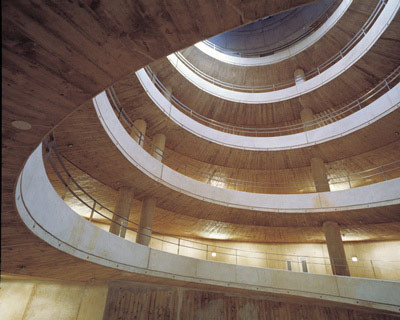 Neben diesem Garagengebäude steht aber noch ein zweites. Es ist die Ausfahrt, die sich geradezu guggenheimmäßig in die Höhe schraubt. Man kann von jeder Parkebene in diese Spirale einfahren. Aber wenn man ganz unten steht, dann bietet sie ein besonders eindrucksvolles Bild. Kein Wunder, dass Kinder ihre Eltern immer überreden wollen, möglichst weit unten zu parken, weil sie das Spektakel der Ausfahrt genießen wollen.