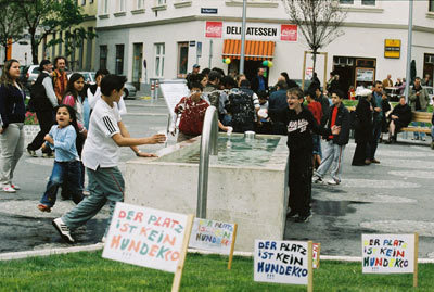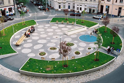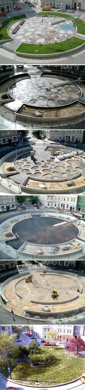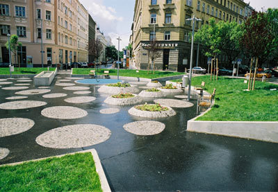 Vier Jahre später sind die Forderungen verwirklicht worden. Dabei hat die Präsenz der Architektin auf der Baustelle ermöglicht, dass der Wettbewerbsbeitrag unverändert umgesetzt worden ist. Das Siegerprojekt greift das gründerzeitliche Thema des Grünrings in veränderter und zeitgemäßer Form wieder auf. Wie der Nutzer diffundiert auch der Asphalt der Straße in das Platzinnere. Das Wasserbecken stellt trotz seiner exponierten Lage kein Hindernis dar, vielmehr greift es die lineare Bewegung des Durchschreitens auf. Die Pfasterung in Form von unregelmäßigen „Inseln“ aus Granitkleinsteinen bildet ein „Spielmuster“. Die Platzmitte selbst bleibt unbetont, vielmehr soll sie beim Durchschreiten erahnt werden.