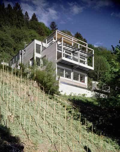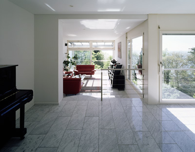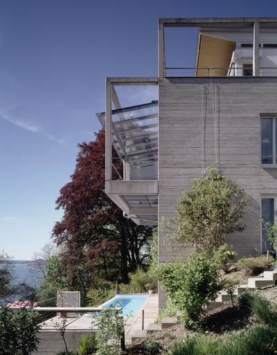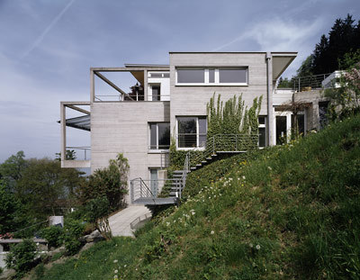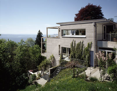 Zwar scheint das betont orthogonale „Gerüst“ in scheinbarem Gegensatz zum Verlauf des Hangs und zur Kontur der Landschaft zu stehen, doch wurde die Kubatur in drei fein gestuften Raumkaskaden terrassenartig in den Baugrund gebettet. Zudem lag das Augenmerk des Architekten darauf, nahezu alle Räume in die Gunst des begehrten Bodenseeblicks zu versetzen. Wie man sieht, mit Erfolg. (Text: Gabriele Kaiser)
