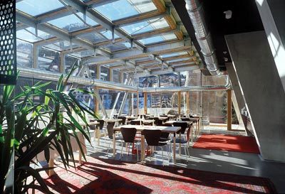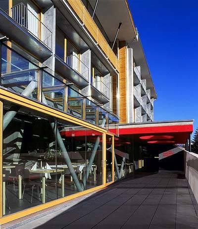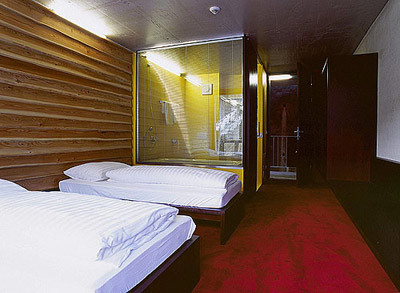 Die Zimmer (man wähle zwischen Rot und Blau) stillen rustikale Bedürfnisse bestenfalls zitathaft in Form einer Rauspundverschalung über dem Kopfteil der Betten, das im Gelbton gehaltene Bad ist per Glaswand räumlich integriert, jedoch steht für den separatistischen Bedarfsfall eine Jalousie im Scheibenzwischenraum zur Verfügung. Elemente wie der Wellnessbereich mit Sauna, eine Bar und ein Terrassenrestaurant gehören in dieser Kategorie ohnehin zum guten Ton, aber im „Lux Alpinae“ werden die Gäste auch in haustechnischer Hinsicht verwöhnt – alle Zimmer sind mit Telekommunikation über eigens zur Verfügung gestellte Gästehandys ausgerüstet. Vielleicht sind es „Surplus“ wie diese, die den Besucher zur erholsamen Wiederkehr animieren? (Text: Gabriele Kaiser)