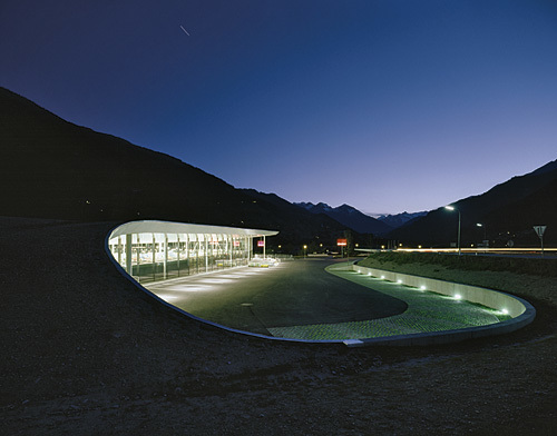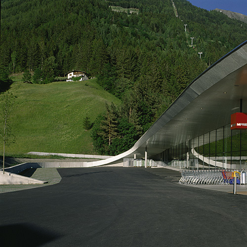 Wie eine Zunge streckt sich plötzlich eine grüne Plattform von der Straße weg, schleckt die Weite der Natur ab. Ihre Kanten sind weich, amorph. Da, wo die Zunge in die Straße mündet, schmiegen sich die beiden Kantenenden an die Straße an und kaschieren den Geländesprung. Unter der weit ausladenden Ebene - von Dach kann man hier kaum mehr sprechen - befindet sich das lang gestreckte Lebensmittelgeschäft. Die Fassade springt hinter die Dachkante weit zurück, im Freiraum sind auf diese Weise einige überdachte Parkplätze definiert. „Die fließenden Formen, die übers Eck jedoch kantig ausgeführt sind“, beschreibt Architekt Hans-Peter Machné, „sind Teil des Entwurfs, der im weitesten Sinne mit der Dualität zwischen Landschaft und architektonisch gesetzten Eingriffen spielt.“ Im Klartext: Rein grundrisstechnisch ordnet sich der M-Preis der städtebaulichen Situation unter, übernimmt Ausrichtungen und Achsen. Vom Ambiente her wirkt er aber weniger als Bauwerk denn als weit gerecktes Hallo aus dem Berghang heraus.