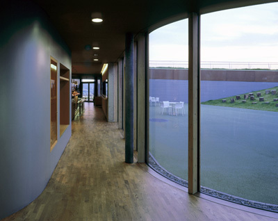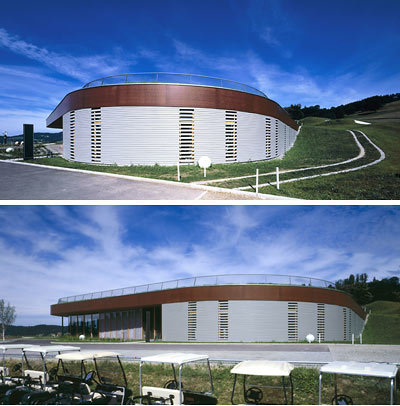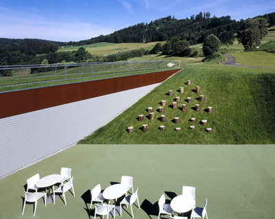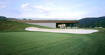 Der bumerangförmige Baukörper liegt, steht oder schwebt mit scheinbarer Leichtigkeit im Terrain, nimmt Hanglinien auf, spielt mit deren Verlauf, verschwindet im Grün. Mit raumhoher Verglasung öffnet sich die Raumschlaufe, gewährt freie Sicht auf das Geschehen an Platz und versucht nie als „Hochbau“ in Erscheinung zu treten. Die „Formation“ entzieht sich dem üblichen Dualismus zwischen Bauwerk und Landschaft: in dieser gebauten, Natur simulierenden Landschaft ist das Clubhaus selbst ein „naturräumliches“ Element. (Text: Gabriele Kaiser)