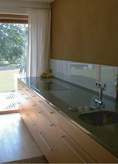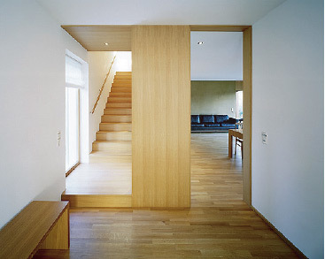 Auch im Innenausbau gelang es, ökologische Gesichtspunkte ohne Reibungsverlust auf Seite der Gestaltung zu berücksichtigen. Möbel und Böden in Eiche bzw. Lärche geölt schaffen eine reduzierte, aber warme räumliche Gesamtsituation, in der funktionale, formale und ressourcenschonende Planungsentscheidungen „harmonieren“. (Text: Gabriele Kaiser)