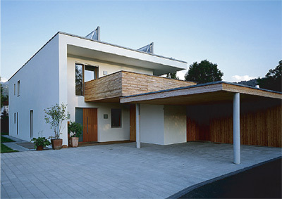 Das Haus wurde in klassischer Massivbauweise errichtet (gebrannte Tonziegel, Stahlbetondecke) und konnte durch präzise Detaillierung (konsequente Vermeidung von Wärmebrücken) und entsprechende Dämmmaßnahmen auf Passivhausstandard gebracht werden. So ist etwa das Kellergeschoss wärmetechnisch von den oberen Geschossen entkoppelt. Das innovative Energiekonzept, das in Zusammenarbeit mit Xaver Peter entstand, macht dieses souverän in den Grünraum gesetzte Wohnhaus zu einem echten Nullenergiehaus. Warmwasserbereitung und Heizung werden zur Gänze durch Solarenergie betrieben, eine kontrollierte Be- und Entlüftung sorgt für den nötigen Luftausgleich, die Verteilung der Wärme in die Wohnräume erfolgt über Heizschlangen in Boden und Decke, ein Steuergerät regelt dezent und nahezu autonom die Abläufe.