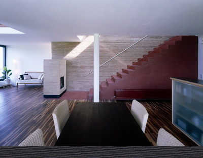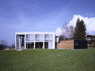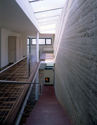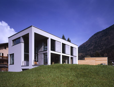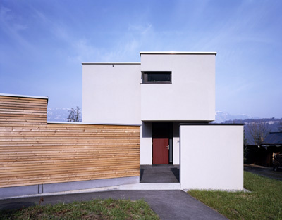 Der in Massivbauweise errichtete Baukörper präsentiert sich als kompaktes Gefüge, das sich zur Sonne als schlankes Skelett öffnet. Richtung Süden verfügen alle Räume über raumhohe Fenster, die nicht nur den Bergblick rahmen, sondern auch die Einstrahlung der Sonne zur Nutzung der passiven Sonnenenergie garantieren. Behagliches Kernstück dieses Hauses ist zweifellos die „Ofenwandstiege“, ein Ensemble aus einer zweigeschossigen Lehmstampfwand und einem mit Holz beheizbaren Lehmofen, entworfen und realisiert vom Schlinser Lehmbaumeister Martin Rauch. (Text: Gabriele Kaiser)