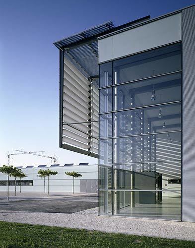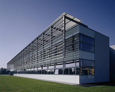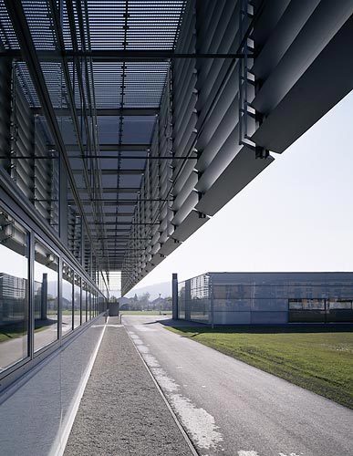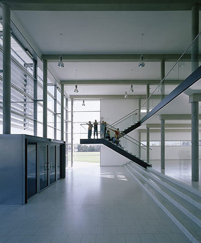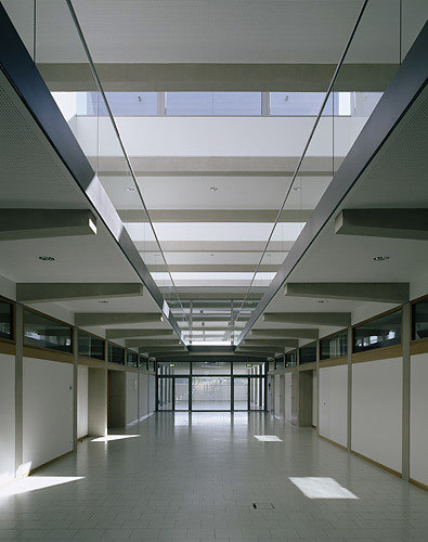 Den beiden verglasten Längsfassaden der Schule sind in erheblicher Distanz zu den Fensterbändern Sonnenschutzlamellen vorgeblendet, um eine optimale passive Ausnutzung der Sonnennergie zu gewährleisten. Die homogene Verteilung des Tageslichts spielt in dem ausgewogenen Baukörper eine wesentliche Rolle: Eine durchlaufende zweigeschossige Erschießungshalle ist von oben belichtet, sodass Klassen- und Gruppenräume zusätzlich von innen her mit ausreichend Tageslicht versorgt werden. Niedrige Fensterparapete sowie ein in Form und Materialwahl reduzierter Innenausbau sorgen für eine positiv neutrale Grundstimmung, die sich im Reigen vielfältiger baulicher Handschriften stets als Wohltat erweist. Im Sinne der gewünschten Niedrigenergiebauweise verfügt das Schulzentrum über eine Lüftungsanlage mit Wärmerückgewinnung und einen Erdwärmetauscher zur Vorwärmung bzw -kühlung der Quellluft. Das extensiv begrünte Dach ist teilweise begehbar (Freiluftklassen, auf dem Dach der Turnhalle hingegen werden Solarkollektoren zur Warmwasseraufbereitung genutzt. (Text: Gabriele Kaiser)