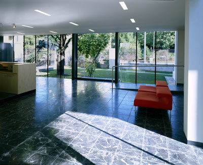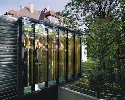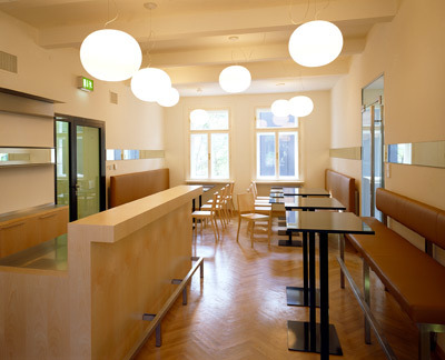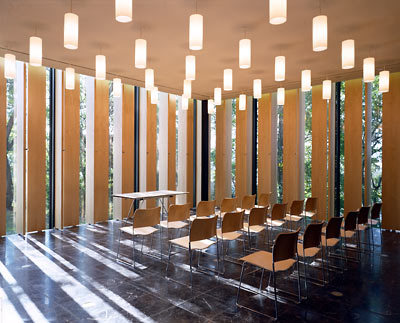 Die lichtfilternden raumhohen Holzlamellen in der Kapelle sorgen für wechselnde Raumstimmungen und fokussieren den Blick auf die Ruhe der Natur. Bei Bedarf kann dieser Andachtsraum unter Einbindung des angrenzenden Seminarraums zum Tagungsraum erweitert werden. Durch geschickte Ausnutzung der Hanglage konnte im ausgebauten Unterschoss ein ebenfalls zum Grünraum orientierter Bibliotheksbereich geschaffen werden, im Seminargebäude wurde als kommunikative Schnittstelle zwischen Seminarbetrieb und öffentlich zugänglichem Kirchenamt eine Cafeteria untergebracht. Die bestehenden Gebäude wurden behutsam saniert und haustechnisch auf neuesten Stand gebracht, zwei neue Aufzüge begünstigen nun die „soziale Zirkulation“ zwischen den zur Einheit verbundenen Trakten. (Text: Gabriele Kaiser)