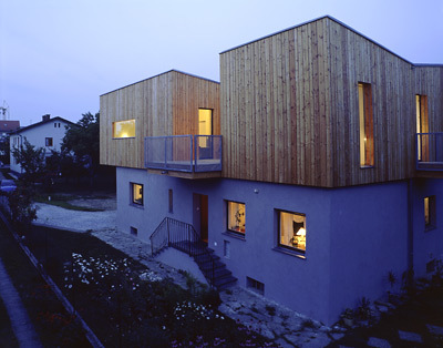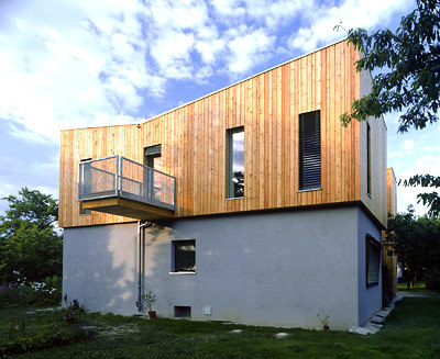 Das alte Haus ist prinzipiell Rechteck, weit ragte das Satteldach vor, aus dem Südwesteck buchtet sich der Wohnraum Gartenterrasse und Südsonnenfenster. Die Bauarbeiten sollten das Leben der Mutter zu ebener Erde möglichst wenig stören schnell vonstatten gehen. Das Satteldach wurde entfernt, statt dessen sitzt nun ein dreischaliger Holzriegelleichtbau am alten Sockel, dessen neuer Anstrich mit der Lärchenschalung harmoniert. Beidseitig beplankt, zellulosegedämmt, mit Dreischeibenverglasung, Erdwärmetauscher und kontrollierter Wohnraumbelüftung erreicht er die Energiekennzahl 24 kWh/(m2a). Er schenkte der Mutter mehr Licht, eine gedeckte Terrasse und eine durch die neue Außendämmung eklatant bessere Energiebilanz.