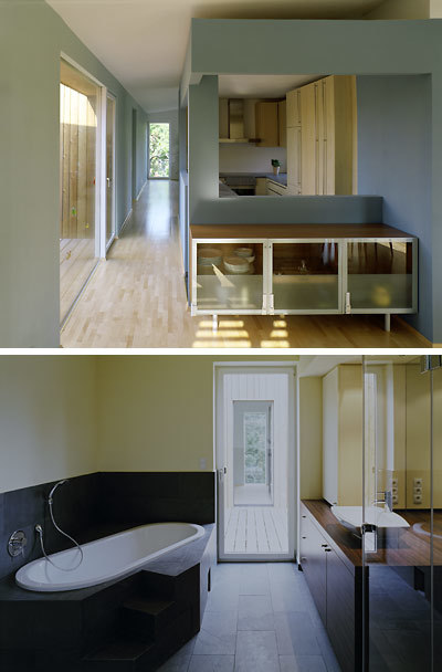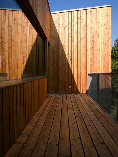Der Zubau variiert grundlegende Altbaumotive. So beansprucht je ein Zimmer ein Haus-Raum- Eck. Jedes Kind hat ein zweiseitig belichtetes zum Garten, der Elternschlafbereich mit Bad ist im Nordosten. Als externer Zugang ist dem unteren, vorspringenden Wohnraum der Stiegenturm im Südosteck vorgesetzt. Die Schalung betont seine Vertikale, ein hoher Glaslichtstreifen belichtet ihn komplett, vom Windfang kommt man ins Büro: die Mutter trat ihr Eckkabinett ab.