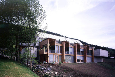 Die innere Erschließungstreppe ist jeweils in die Nordostecke der Häuser gesetzt, wobei sich die Wohnfläche im Obergeschoss trennwandfrei über die gesamte Fläche ausbreitet. Das Beispiel zeigt, dass sich auch in verdichteter Form respektable Wohnverhältnisse schaffen lassen; – die freistehende Villa im Grünen ist längst nicht mehr die einzig verheißungsvolle Lebensform. (Text: Gabriele Kaiser)