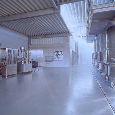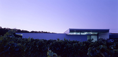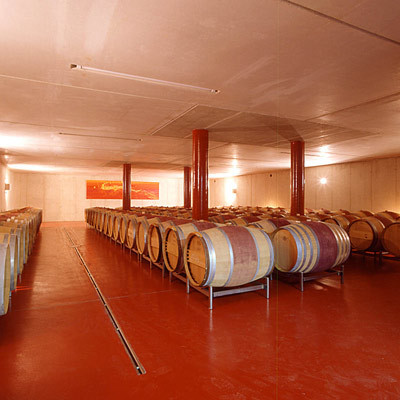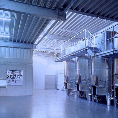Die Stahlrahmenkonstruktion der geradlinigen Halle ist in einen nicht minder puren Mantel aus verzinkten Stahlblechen gehüllt, die vier Stahlbetonstützen des Barrique-Kellers setzen mit ihrer roten Lackfarbe einen kräftigen, mit der warmen Bodenfarbe harmonierenden Akzent. Die Produktionshalle darüber fungiert in ihrer nüchternen Industrialität nicht als Stimmungsträger zur atmosphärischen „Umspielung“ des Weins, sondern zieht sich bewusst und niveauvoll auf ihre funktionale Bestimmung zurück. (Text: Gabriele Kaiser)