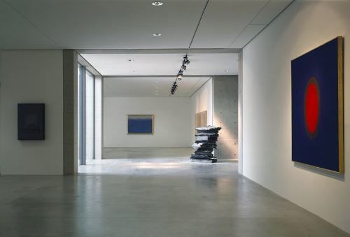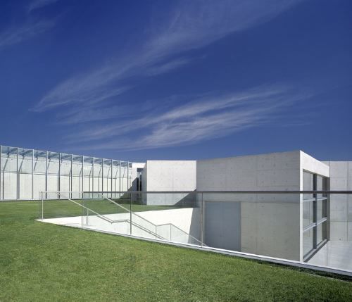Denn es ist eine „unweltliche“ Welt, die der japanische Großmeister des samtenen Betons am Rande einer ehemaligen Nato-Raketenstation gebaut hat. Das Haus selbst weicht zurück, hinter jene geschwungene Wand, hinter die grasbewachsenen Schutzdämme der einstigen militärischen Einrichtung, hinter einen künstlichen Teich, ins Erdreich sogar. Zwei Quader stehen im 45-Grad-Winkel zueinander, der eine lang gestreckt und mit gläserner Hülle um einen massiven Kern, der andere in zwei Hälften geschnitten durch eine Freitreppe, die hinab führt zum sechs Meter tiefen Grund (und dort, leider, als theatralische Sackgasse endet). Die Teilung der Baukörper entspricht der privaten Sammlung, die Marianne Langen und ihr vor 13 Jahren verstorbener Mann Viktor in Jahrzehnten zusammengetragen haben: Wunderbare japanische Zeichnungen auf Papier und Seide finden sich ein im fünf mal 43 Meter messenden Inneren des überschlanken Baukörpers, die Werke der klassischen Moderne in den acht Meter hohen Zwillingssälen des anderen. Dazwischen: Rampen, einfache Bewegungen, Räume mit Ausblick, als träte die raue Landschaft herein.