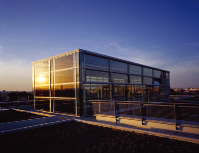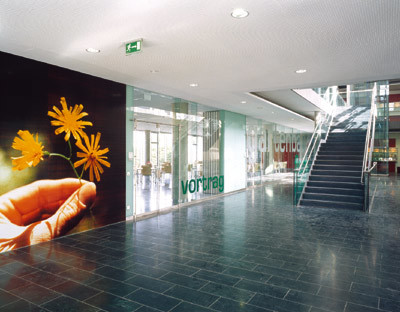 Diese Qualität wurde hauptsächlich dadurch erreicht, dass die Architekten ein Atrium im ersten Stock in den Mittelpunkt des Entwurfs setzten. Das Atrium ist seitlich offen, über einen Steg auch aus dem Park direkt erreichbar und setzt sich in eine Loggia über dem Eingang fort. Diese ist auf drei Seiten offen und vom Körper des dritten Geschoßes überdacht. Die Erfahrung der Logik der inneren Raum- und Funktionsorganisation macht die äußere Erscheinung verständlich.