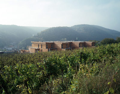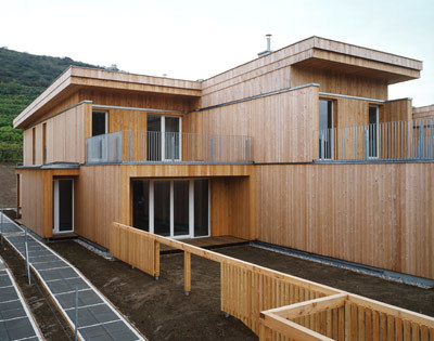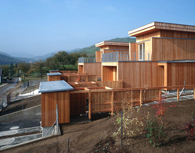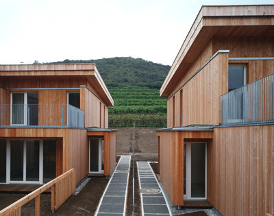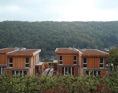 Auf den jeweils nur 9 Meter breiten Parzellen staffeln sich über Vorgarten, Geräteschuppen und Carport die einzelnen Häuser mit je 150 m² Nutzfläche in die Tiefe des hangseitigen Gartens. Ein schmaler, mit Betonplatten ausgelegter Pfad führt vom Vorplatz entlang der Grundgrenze zum Eingang hinauf, der jeweils an der äußeren Hauslängsseite neben einer erkerartigen Ausstülpung liegt. Die kompakte Holzstiege im Inneren mit Abstellraum und Toilette trennt den südwestseitigen Wohn/Koch/Ess-Bereich mit Veranda vom nordöstlich gelegenen Raum mit Terrasse und einem durch einen Betonrahmen gefassten Blick in die Natur. Im Obergeschoss ist talseitig ebenfalls eine Terrasse situiert, von der aus man die Fernsicht auf die Ruine Senftenberg genießen kann. Im geförderten Wohnbau ist die mehrgeschossige Holzbauweise, zumindest in Ostösterreich, immer noch eine Rarität; – diese jedenfalls wurde beim Niederösterreichischen Holzbaupreis 2003 mit einer Anerkennung gewürdigt. (Text: Gabriele Kaiser)