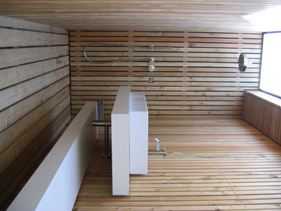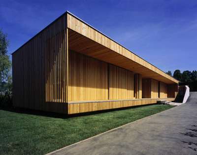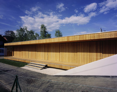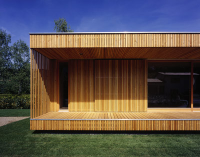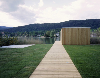 Dem Bestand wurde seeseitig eine Terrasse vorgesetzt, von der ein Holzsteg zum Ufer führt. Ein kleines Badehäuschen als Schlusspunkt der linearen baulichen Annäherung an den See liegt – wie ein kleiner Ableger des Ferienhauses – ruhig im Wasser. (Text: Gabriele Kaiser)