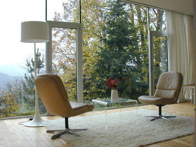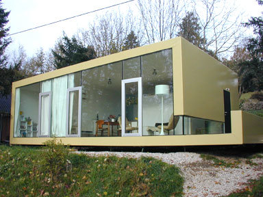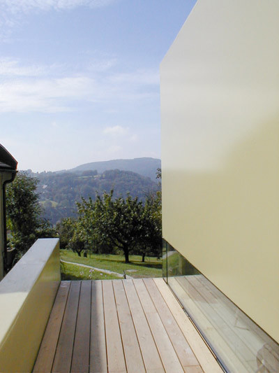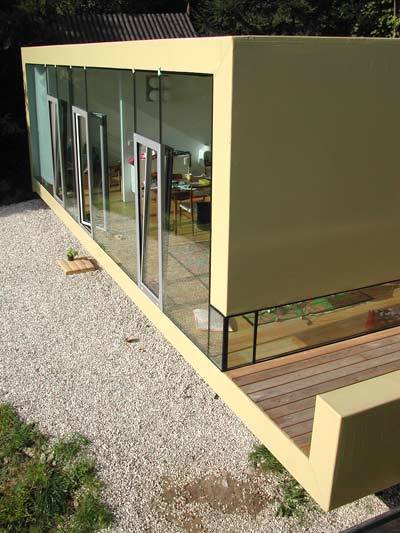 Die kleine Box mit einer Nutzfläche von 66 m² birgt zwei kleine Zimmer sowie einen großzügigen Wohn-Essraum, der sich zum Garten hin öffnet. Frei im Raum steht die Sanitäreinheit, eine zwei Meter hohe Box in der Box, deren „Dachfläche“ bei Bedarf als Gästebett verwendet werden kann. (Text: Gabriele Kaiser)