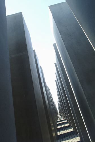 Man versinkt vielmehr in einem Meer von 2751 scharfkantigen Betonstelen, die in sanften Wellen ihre Höhe ändern, sodass der Himmel manchmal greifbar, manchmal unendlich weit entfernt scheint. Die Wege zwischen den Stelen entwickeln sich von sanften Pfaden rasch zu tiefen Schluchten, sie folgen strengen rechtwinkeligen Geometrien, doch ganz zarte Schrägstellungen und Kippungen der Stelen sorgen für verwirrende, verunsichernde Effekte, die vor allem bei scharfem Sonnenschein für das entsprechend irritierende Licht-Schatten-Spiel sorgen. Denn vor allem die Schlagschatten, die die Stelen einander quasi stumm zuwerfen, überhöhen und verzerren die leichten Schrägen der Betonklötze zu einem surrealen Licht-Schatten-Grau-Geflirre.