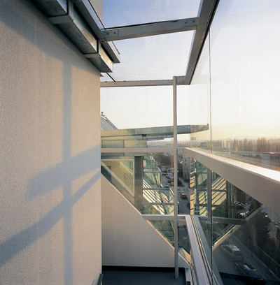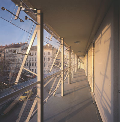 Als transparenter Schuppenpanzer zeigt sich der straßenseitige Laubengang im Westen. Über die Brüstungen ragen schräge Glasflächen, die vor Schneeverwehungen u.ä. schützen. Die eingeschossigen Tops dahinter bieten einen langgestreckten Esskochwohnraum mit Loggia zum Hof mit Baumblick im Osten, mittiger Küche, der Essplatz ist vom Laubengang belichtet. Davor liegt der nischenreiche Gangvorraum zu Bad, Toilette und Zimmer mit Loggiazugang. Die Maisonetten haben unter der Gaube mit Balkon einen durch zwei Stufen erhöhten Sitzplatz. Von hier genießt man ein beachtliches Panorama, die hoch ansetzende Dachschräge erzeugt Mansardgefühl, ohne viel Platz zu rauben. Der Laubengang mündet im Süden in eine weitere Wohnung, wodurch das Haus gemauert an den Nachbarn stößt. Das schuppige Glas setzt sich hier fort: mit Lochblech geschlossen, wird es zum staufreundlich ausgebuchteten Fensterelement.