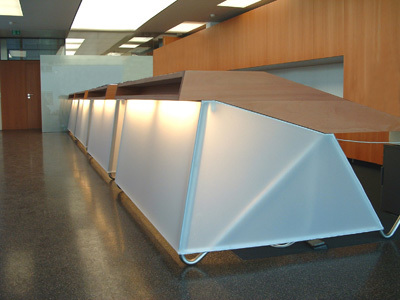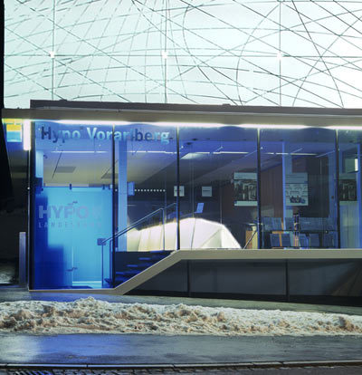 Die neue Erdgeschosseinfassung mit ihrer charakteristischen Wellengrafik im Obergeschoss verschafft dem Haus außer einer neuen Strahlkraft auch einen Hauch Noblesse. Das Erdgeschoss wurde ausgehölt und komplett erneuert. Eigens entworfene Pulte geben dem übersichtlichen Schalterraum nun eine besondere Leichtigkeit, helles Buchenholz, sowie eine strukturierte Raum- und Lichtführung schaffen jenes kundenfreundliche Ambiente, mit dem Banken heute ihre Dienstleistungsorientheit erfolgreich zum Ausdruck bringen. (Text: Gabriele Kaiser)