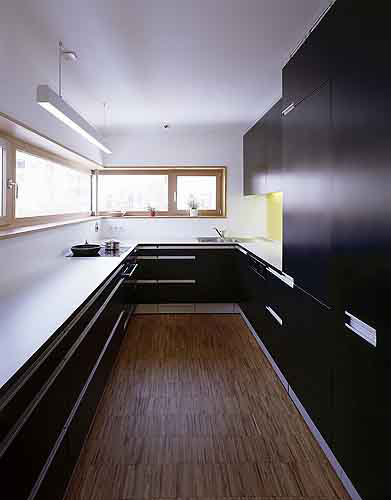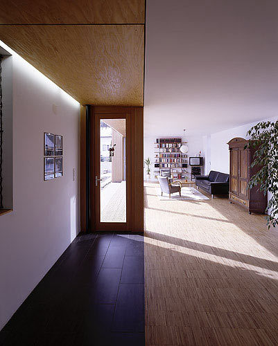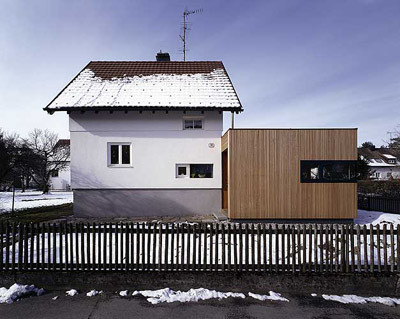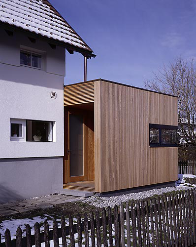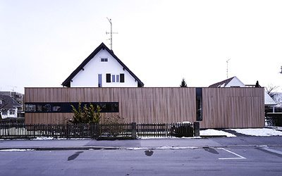 Am südwestlichen Ende des länglichen Zubaus, in dem sich ein großer Wohn/Essraum mit gartenseitiger Veranda befindet, wurde die Garage situiert, zwischen den beiden Bauteilen vermittelt ein den Bestand öffnendes, schön belichtetes Erschließungsgelenk. Die beiden Geschosse des kleinen kubischen Bestands werden nun als Rückzugsbereich (Kinderzimmer, Bäder, Räume der Eltern) genutzt. An der Fassade weist nur ein stehender Lichtschlitz auf den zurückhaltenden Eingriff der Architekten hin. (Text: Gabriele Kaiser)