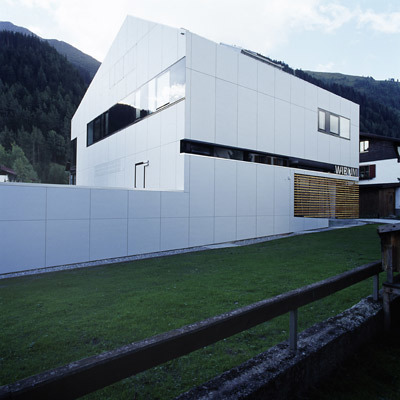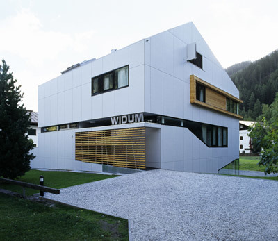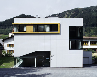 Fensterbänder, übereck geführte außenbündige Glasflächen und die dach- und wandübergreifende Außenhaut betonen die Homogenität des kompakten Volumens, die holzgefasste, über die Südwestecke geführte Fensterreihe im Obergeschoß tritt im Gegensatz dazu plastisch aus der Kubatur. (Text: Gabriele Kaiser)
