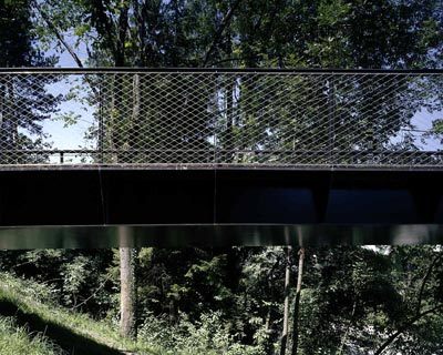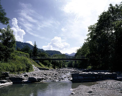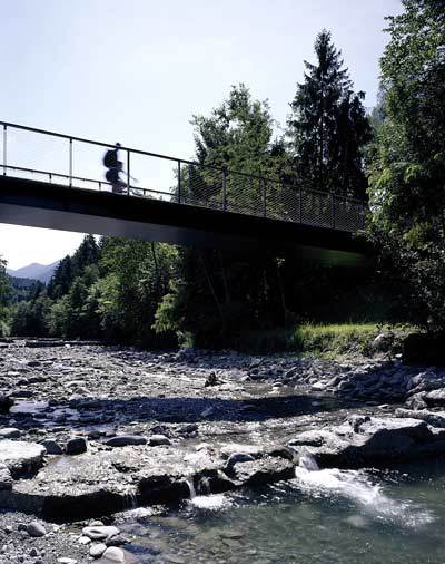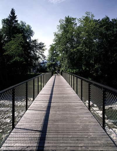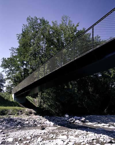 Im Unterschied zur aus Brettschichtholz gefertigten und überdachten Brücke in Gaissau (siehe gesonderten Eintrag) ist die Verbindung von Ufer zu Ufer hier nicht als tunnelähnliche Passage konzipiert, sondern als offen den Fluss querender Steg. War im jenem Fall die räumliche Fassung maßgeblich, ist es im diesem die zurückhaltende Noblesse eines möglichst reduziert gestalteten Verkehrswegs. (Text: Gabriele Kaiser)