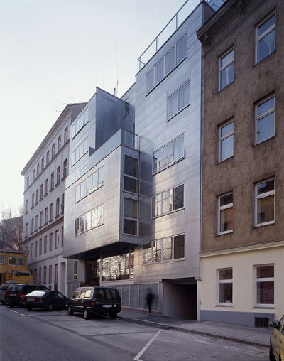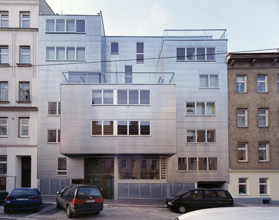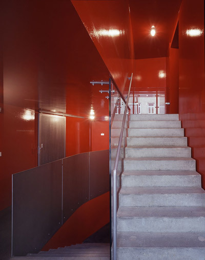 Die Gebäudehülle wird von einer hinterlüfteten Leichtwand gebildet, die aus Stahlkassetten mit Wärmedämmung besteht und zur Straße hin mit Platten aus Titanzink und raumseitig mit Sperrholz verkleidet ist. Die Fenster sind spezielle Holz-Aluminium-Konstruktionen. In der Material- und Farbwahl - besonders hervorzuheben: das glänzend rot gestrichene Treppenhaus, das im Straßenraum hervorblitzt - ist das Projekt typisch für die räumliche Choreografie von Artec: plötzliche Materialwechsel, unvermitteltes Aneinanderstoßen von Raumschichten und im Inneren eine Kombination aus kräftigen Farben und Texturen.