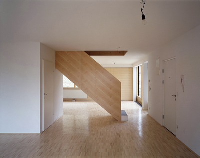 Geiswinkler und Geiswinkler beweisen, dass sich das Prinzip der „gestapelten Einfamilienhäuser“ auch in diesem Umfeld erfolgreich realisieren lässt. Die Wohnungen sind zweigeschoßig angelegt und verfügen jeweils über einen raffiniert angelegten Freibereich, der aus einer kleinen Terrasse, einem Stück Wiese und einem „Vertikalgarten“ besteht und einen Puffer zwischen der Wohnung und dem Straßenraum bildet. Einblick in diesen Freibereich ist immer nur von Räumen der eigenen Wohnung aus möglich. Das Konzept ergibt für die Wohnräume eine erstaunliche Balance aus Öffnung und Intimität, die sich noch steigern wird, wenn die fünf Meter hohen Rankgerüste der seitlichen Loggienwände bewachsen sind. Die oft von Bauträgern geäußerte Behauptung, dass Bewohner in der dicht verbauten Stadt keine Loggien und Balkone wünschen, weil man diese nicht nutzen könne, wird hier eindrucksvoll widerlegt.