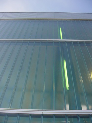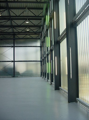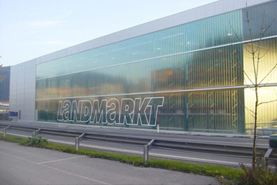 Typologischer Ansatzpunkt ist das Thema „Markthalle“, in der Lagerung und Verkauf unmittelbar nebeneinander und vom Straßenraum aus ersichtlich koexistieren. Dabei gehört eine klare räumliche Organisation der einzelnen Funktionsbereiche ebenso zu den Voraussetzungen für eine reibunglose Warenzirkulation wie ein entsprechend qualifiziertes Personal. Wenn das umfangreiche Produktangebot entsprechend großzügig und kundenfreundlich präsentiert wird, darf mit erhöhter Kaufbereitschaft gerechnet werden. Die Stahlbaukonstruktion der Halle ist in einen geschwungenen Mantel aus Profilitglas gehüllt, der die gesamte Attikazone und die Nordfassade überspannt. Luxuriöse Raumhöhen, breite Gänge und eine gleichmäßige angenehme Belichtung sorgen dafür, dass man im Markt stets den Überblick behält. (Text: Gabriele Kaiser)