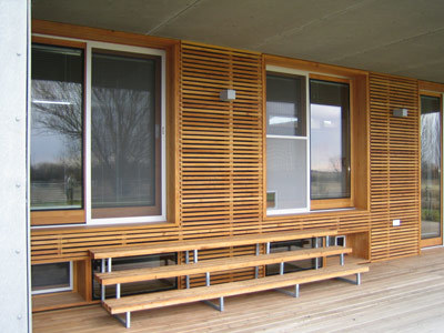 Als eigenes Häuschen springt der innen und außen mit grauem Eternit verkleidete Windfang Eintretenden entgegen, als Häuser im Haus stehen Sanitär-Speisbox und Kellerstiege im Einraum unterm Holzdachstuhl. Vom nordosteitigen Oberlichtband fällt die Sonne durchs Südwestglas bis auf die Terrasse.