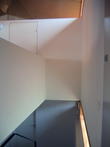 Die nordwestliche Haushälfte ist raumgewinnend mit einem oberlichthellen Gästezimmer unterkellert, was sich in der um vier Stufen erhöhten Ebene im Einraum niederschlägt. Selbstverständlich schafft sie dem privaten, von zwei Meter hohen weißen Zwischenwänden umhausten Schlafbereich und dem gemeinsamen Wohnen/Kochen/ Essen verschiedene Raumcharaktere, die im Zwischenreich der Lesegalerie lose ineinanderfließen. Liegend ruht man hier für sich, sitzend blickt man über das podestbegleitende Sitzmöbel am Kamin in den ganzen Wohnraum.