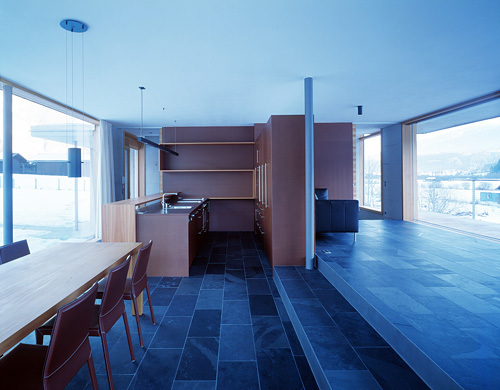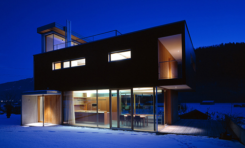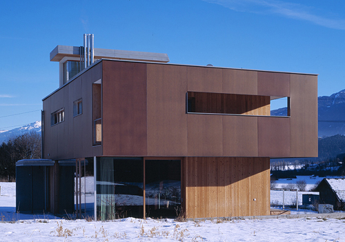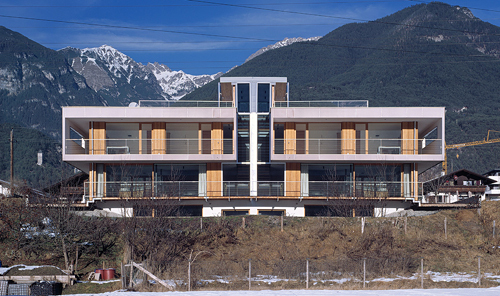 Auf einem Bauplatz am Siedlungsrand erstreckt sich jeweils eine Doppelgarage mit Lagerraum entlang der Nordgrenze als Puffer zur zu erwartenden Bebauung nördlich der Parzelle. Gleichzeitig bildet eben dieser Baukörper gemeinsam mit dem eigentlichen Doppelhaus einen geschützten Hof, der als Garten genützt wird. Nach Osten bzw. Westen ausgerichtete, teilweise überdachte Terrassen bieten private Außenräume. Das Wohngebäude selbst, das sich entlang der südlichen Hangkante erstreckt, öffnet sich weit gehend von der Ess-/Kochebene Richtung Hof und von der etwas höher gelegenen Wohnebene Richtung Freiland - den Innauen.