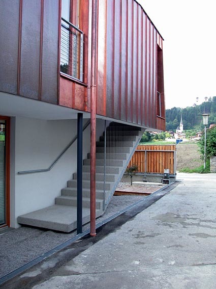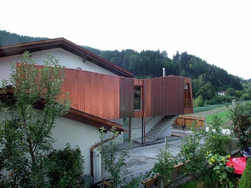 Ein bestehendes Gebäude wurde um eine Wohnung für eine agile 80-jährige Familienangehörige erweitert. Die Wohnung wurde, nach Wunsch der Baufrau, im ersten Obergeschoß mit separatem Zugang über die überdachte Freitreppe in sehr kurzer Bauzeit (2 Monate) errichtet.Neben dem Neubau der 40 m² Wohnung wurde das Anfang der 70er Jahre gebaute und vom neuen Eigentümer kleinweise selbst veränderte Einfamilienhaus mit wenigen gezielten Eingriffen auf die heutigen Bedürfnisse und technischen Standards angepasst. (Text der Architekt:innen)