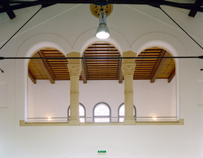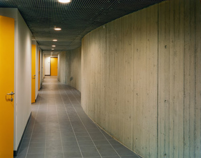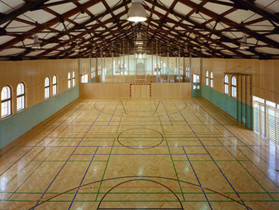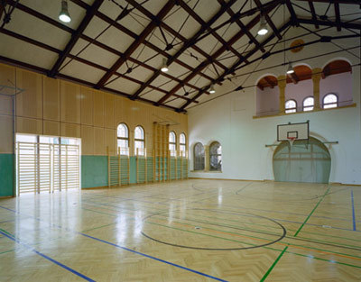 Da die vorhandene Substanz des Gebäudes unter strengstem Denkmalschutz steht, war die Erhaltung bzw. Sanierung der bestehenden Bauteile von Anfang an zwingend. Die für ihre Zeit als geradezu Hightech anmutenden weitgespannten bestehenden Stabknotenfachwerksträger der Dachkonstruktion blieben erhalten und wurden mit zusätzlichen, dazwischenliegenden, gleichartigen Trägern ergänzt, um der Last des neuen wärmeisolierten Dachaufbaues gerecht zu werden. Diese Träger wurden als Kontrast von tragend zu füllend schwarz gestrichen, wodurch die bestehende, im Inneren faktisch unstrukturierte Gebäudehülle, gegliedert, aber in ihrer Substanz belassen wird. Sie wurde so unterteilt, dass eine Normalturnhalle, eine dreiteilbare Spielhalle, sowie eine Bodenturnhalle untergebracht werden konnte. Die durch schlanke, vertikale Stahlprofile ausgestreiften Glaswände gehen bis an die Dachuntersicht und lassen die Dimension und das Volumen der Gesamthalle präsent sein.
