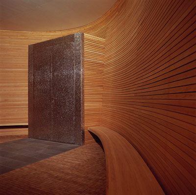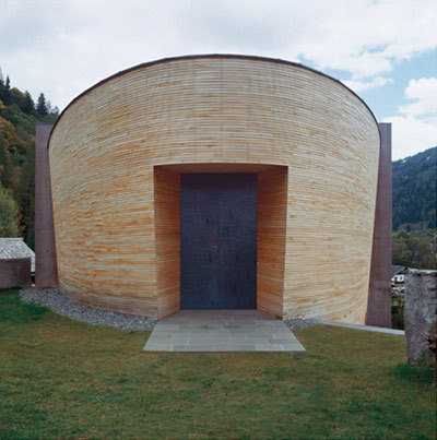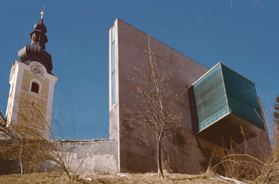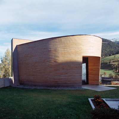 Das Bauvolumen weist eine markante architektonische Gliederung auf, sichtbar im Materialwechsel von Holz zu Sichtbeton zu Glas. Die Dreiteilung beginnt mit dem Versammlungsraum, einem Holzriegelbau in Schiffform. Sowohl für die Haut des Innenraums als auch für die Bekleidung des parabelförmigen Außenbaus wurden sägerauhe Eichenriemen eingesetzt. Die "schwebende” Sitzbank nutzt die konisch nach oben verlaufende Form der Wand als Rückenlehne. Liturgische und Bestattungsgerätschaften, wie Altartisch, Weihwasserschale, Kruzifix, und Kandelaber, sowie Bahre und Kranzständer wurden von Tomas Hoke geschaffen. Der "Bauch des Schiffes” ist geschlossen, ein Ort der Ruhe und Konzentration. Er stößt an den monolithen Torbau aus gefärbtem Stahlbeton, der mit seinem umlaufenden Lichtband den Bruch zwischen dem organischen Holzbau und dem kristallinen Glasbau markiert. Die Sichtbetonwand mit ihrem warmen Eisenoxydrotton dient als Untergrund für das Bildprogramm des Malers Armin Guerino. Zwei Überthemen stehen im Zentrum: die Jakobsleiter mit ihrem virtuellen Begleiter - dem Schatten, eine Interpretation des Malers und die Labyrinthverdoppelung als Träger der Metamorphose des menschlichen Seins.