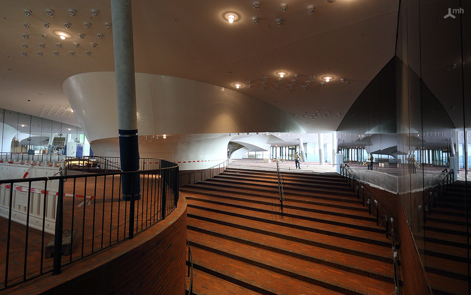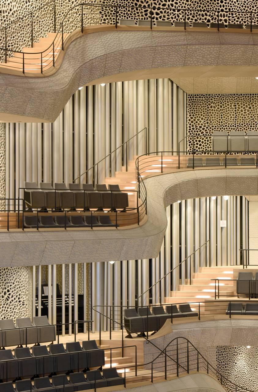 Sie werden über drei Stockwerke hinweg mittels schräger Stahlverbundstützen von der Fassadenebene in die nächste Stützenreihe hinter der Fassade geleitet. Die Deckenränder dieser drei Stockwerke wiederum sind von oben abgehängt. Um den größeren stützenfreien Eckbereich an der sich 110 m hoch auftürmenden Westseite zu ermöglichen, wurde hier noch zusätzlich zu dieser Konstruktion ein um die Gebäudeecke geführter geschosshoher Fachwerkträger in der Fassadenebene der Etage über der Plaza-Ebene eingebaut. Skulptural ausgeformte Räume, schräggestellte Stützen, elegant sich aufwärts schraubende Treppenanlagen, eine durchlaufende Plaza-Fuge und die kühne Dachlandschaft schlugen als komplexe Konstruktionen in den Kosten zu Buche. Doch dies, wie verschiedentlich geschehen, zu kritisieren heißt, das Projekt Elbphilharmonie insgesamt infrage zu stellen. Gewiss, nicht bei jedem Bauwerk sind solche Maßnahmen gerechtfertigt. Aber hier, bei diesem für die Stadt Hamburg so eminent wichtigen Haus, ist der Einsatz angemessen.