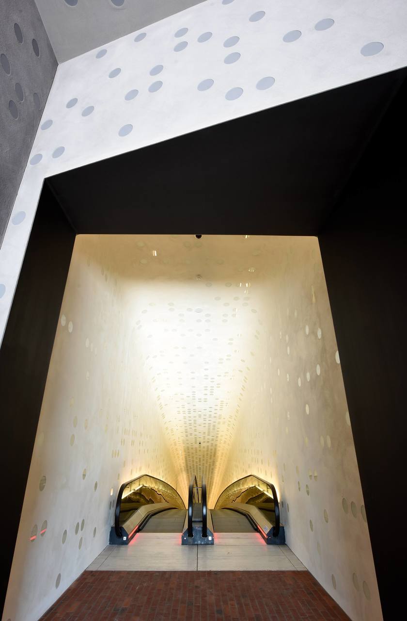 Nun konnten die alten Decken vorsichtig im Sägeverfahren bündig zur Innenwandoberfläche abgetrennt werden. Danach ging es an die Fundamente: Man fand 1 111 Ortbeton-Rammpfähle vor, 50 cm dick, zwischen 15 und 19 m lang. Sie besaßen eine 30-40 % höhere Tragfähigkeit als bei der Gründung. Das erstaunliche Phänomen resultiert aus mehreren Gründen – der wichtigste war die durch die beständige Tidenströmung und das große Pfahlvolumen verursachte Verdichtung des Sandbodens. Dennoch wurden zusätzliche 620 Teilverdrängungspfähle gesetzt, die nun, gemeinsam mit den über ein halbes Jahrhundert alten Pfählen, die neue Lastenverteilplatte tragen. Die neuen Etagendecken im Bereich des Speichers wurden über Auflagertaschen an das Mauerwerk angeschlossen – nicht jedoch auf der Ostseite: Der dortige neue Haupteingang ins Gebäude wurde von Herzog & de Meuron als fast 60 m breiter horizontaler Schlitz geplant, der nicht durch Stützen unterbrochen werden sollte. Ein gestalterischer Einfall, der großen konstruktiven Aufwand nach sich zog: So wurden die Lasten der Backsteinfassade mittels einer konstruktiven Verdübelung in einen gewaltigen, 4,30 m hohen Abfangträger an der Innenseite der Außenwand geleitet. Ansonsten werden Nutz und Eigenlasten, die entlang der Bestandsfassaden anfallen, über neue Stahlbetonstützen und über deckengleiche Unterzüge auf der Fassadeninnenseite abgeleitet. Da vom Denkmal Kaispeicher A nichts als seine Außenmauern blieb, war deren Sanierung und Erhaltung von essenzieller Bedeutung.