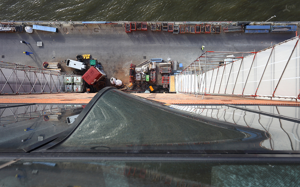 Was immer den Ausschlag gab: Der Speicher musste, wenngleich ein Denkmal, vollständig entkernt werden. Doch das Ingenieurbüro Schnetzer Puskas International aus Basel, das für die Planung des Tragwerks zuständig war, hat schon oft mit Herzog & de Meuron zusammengearbeitet und ist Herausforderungen gewohnt. Entscheidend für das Gelingen dieses im Verlauf der Planung immer üppiger werdenden Baus war, dass die Ingenieure von Beginn, also von den ersten Skizzen an, dabei waren und das Tragwerk so in enger Zusammenarbeit zwischen Architekten und Ingenieuren entstehen konnte. Für den radikalen Umbau des alten Kaispeichers wurden Rohwer Ingenieure hinzugezogen. Als erste Maßnahme wurden die Außenwände durch eine umlaufende Stahlkonstruktion gesichert, die aus Gerüsttürmen und daran angeschlossenen horizontalen Gurten bestand.
