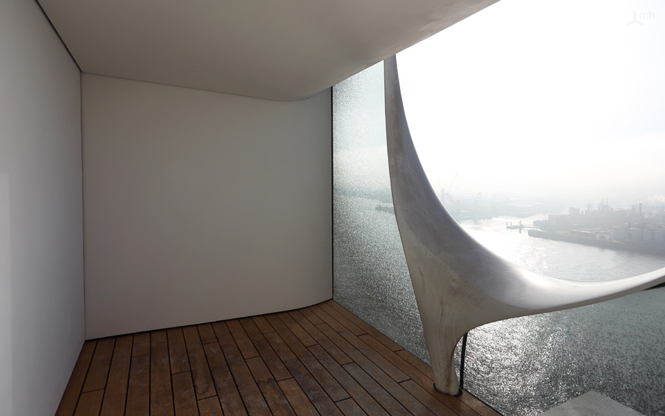 Eine der zentralen gestalterischen Maximen für die Außenwirkung der Elbphilharmonie ist die klare Trennung zwischen dem steinernen alten Sockelbau und dem gläsernen neuen Aufbau, der gleichsam zu schweben scheint. Auf der einstigen Dachebene des Kaispeichers, in 38 m Höhe, befindet sich heute die jedermann offenstehende Plaza mit ihrer umlaufenden Galerie. Sie sollte als durchgehende Fuge in Erscheinung treten, die nicht durch äußere Stützen unterbrochen wird. Obwohl das Gewicht der riesigen Glaselemente des Aufbaus immens ist, wurde also auf eine außenliegende Stützenreihe auf der Plaza-Ebene verzichtet, was bedeutete, dass die Vertikalkräfte einen Umweg ins Innere nehmen mussten.