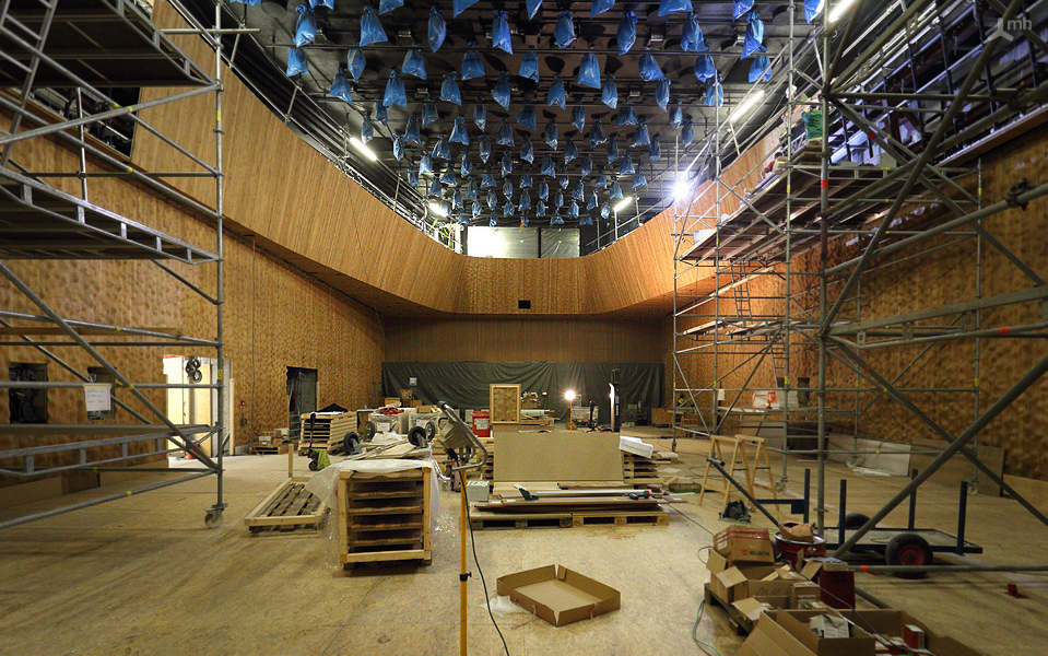 Doch der Vorteil der akustischen Abschirmung barg auch einen Nachteil: Der auf Federn ruhende Saal bildet ein Masse-Feder-System, das sich über die auskragenden Zuschauerbalkone leicht zum Schwingen anregen lässt. Mit einer Abstimmung der Federpakete auf eine optimierte Frequenz und der entsprechenden Steifigkeitsverteilung in der Stahlkonstruktion sowie zusätzlichen Schwingungstilgern im Bereich der Brüstungen konnte eine entsprechend optimale Konstruktion gefunden werden.