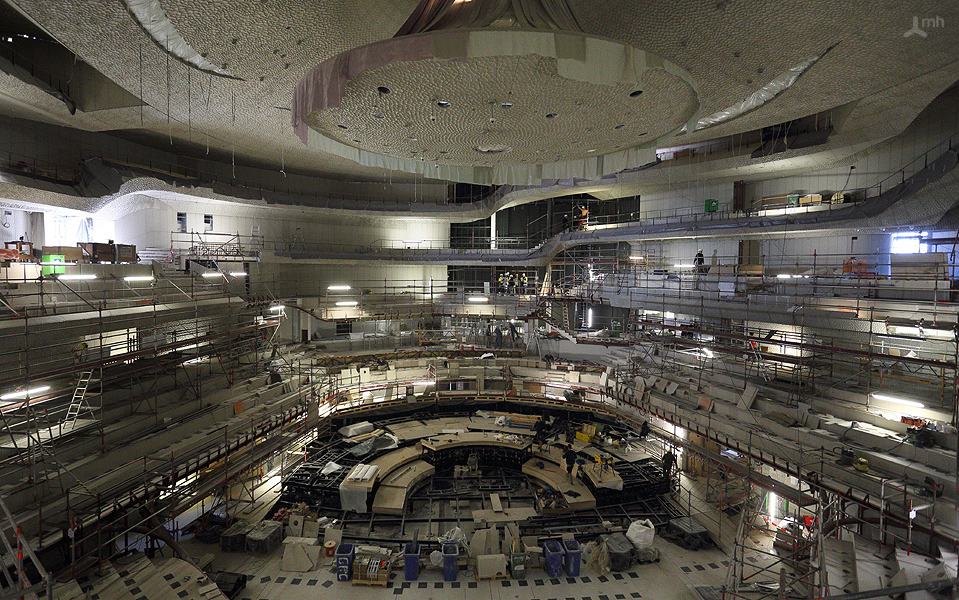 Trotz der ungleichen Lastverteilung musste sich das Stützenraster des Neubaus am weiterhin relevanten Raster des Speicherfundaments orientieren. Gerade jedoch der Große Saal für 2 150 Besucher negiert mit seinen Ausmaßen dieses Prinzip und wurde – auch zur akustischen Entkoppelung vom restlichen Gebäude – als eigenständiger Baukörper geplant: ein 12 500 t schweres »Ei«, das zwischen den Geschossdecken der Wohn- und Hotelnutzungen liegt und in Querrichtung zugleich bis an die Nord- und Südfassade ragt.