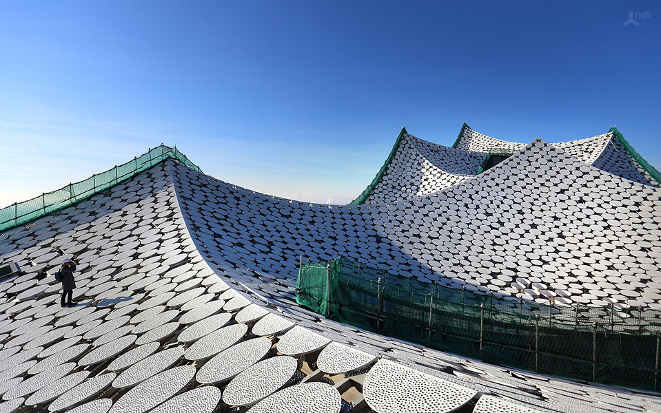 Die Dachkonstruktion des Konzertsaals musste eine Weite von 50 m stützenfrei überwinden. Die Dach-Außenschale besteht aus einem 600 t wiegenden, sich von 72,5 m auf bis zu 91,5 m Höhe aufschwingenden Stahlverbund-Raumfachwerk, dessen Höhe zwischen zwei und neun Metern schwankt, und einer darauf aufgelagerten 20 cm dicken Betonschale. Diese gewaltige Konstruktion muss immense Lasten aufnehmen: nicht nur die der inneren Dachschale, die auf ihrer Oberseite fünf Schichten Spritzbeton aufweist und über Hänger und Federpakete mitsamt der sogenannten Weißen Haut darunter daran aufgehängt wurde, sondern auch die der zwischen Saal- und Gebäudedach angeordneten Technikebene. Letztere allein wiegt mit 8 000 t so viel wie 14 A380-Flugzeuge.