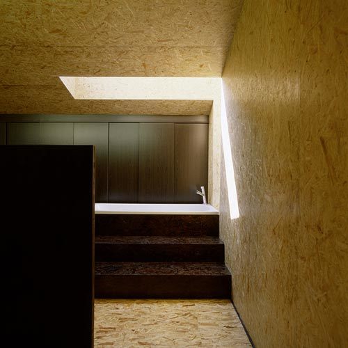 Onkel Freds Hütte ist eine veredelte Kreuzung aus japanischer Lebensart und heimischer Bautradition. Das sattelbedachte Haus steht in einer Dichtbetonwanne, die sich in die Gartenerde senkt und dem Wohnraum im Süden einen exklusiven Vorhof schenkt. Dieser Kunstgriff ermöglicht es, unterm First zwei Ebenen unterschiedlicher Atmosphäre zu kreieren, weder Regenrinne noch Vordach stören den Archetypus Haus. Unter der breiten Holzfront, die schattig übers Sonnenfenster ragt, ruht Onkel Fred unter der leichten Dachschräge. Drei breite Stufen führen aufs Schlafpodest mit Schrankwand, unter einem zarten Oberlichtschlitz ist sogar noch eine Wanne integriert. „Das obere Geschoß ist extrem introvertiert, das untere dafür sehr weit. Der kleine Raum braucht das kontrastreiche Raumempfinden“, sagt Gernot Hertl, es sei spannend, jeden Quadratzentimeter zu nutzen.