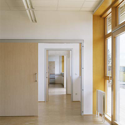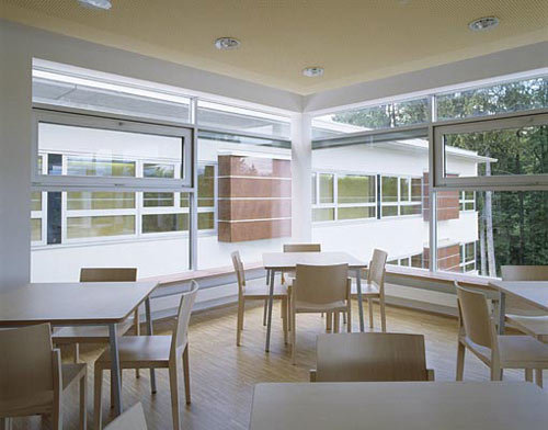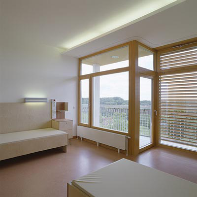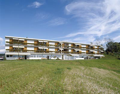 Da die Wohnbedürfnisse innerhalb der verschiedenen zu betreuenden Menschen grundsätzlich die gleichen sind, wurde darauf geachtet, dass das Gebäude sowohl für Schwerbehinderte als auch zum Beispiel für alte Menschen mit noch teilweise erhaltener Selbstständigkeit geeignet ist. Die südlich orientierten Zimmer sind jeweils mit einer behindertengerechten Sanitärbox und einem Sitzbereich an der Südfassade ausgestattet. Zusätzlich wird jedem Zimmer ein behindertengerechter Freibereich in der Form einer Loggia zugeordnet. Die Zimmer wenden sich der Ruhe und Weite der Landschaft zu. Die Küche, in den Wohn- Essbereichen integriert, stellt den zentralen, warmen Punkt dieser Bereiche dar und versammelt mit seinen Kochgerüchen, dem Geschirrklappern, und mit altvertrauten Tätigkeiten die Gemeinschaft. Die Werktherapieräume im Untergeschoss orientieren sich ebenfalls nach Süden und sind mit Teeküchen und Rückzugsnischen ausgestattet. Eine direkte Verbindung mit der Umgebung wird durch die vorgelagerten Holzterrassen, überdacht mit Markisen erreicht. (Text: Architekten)