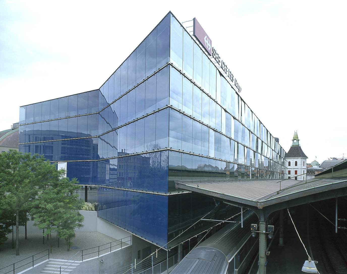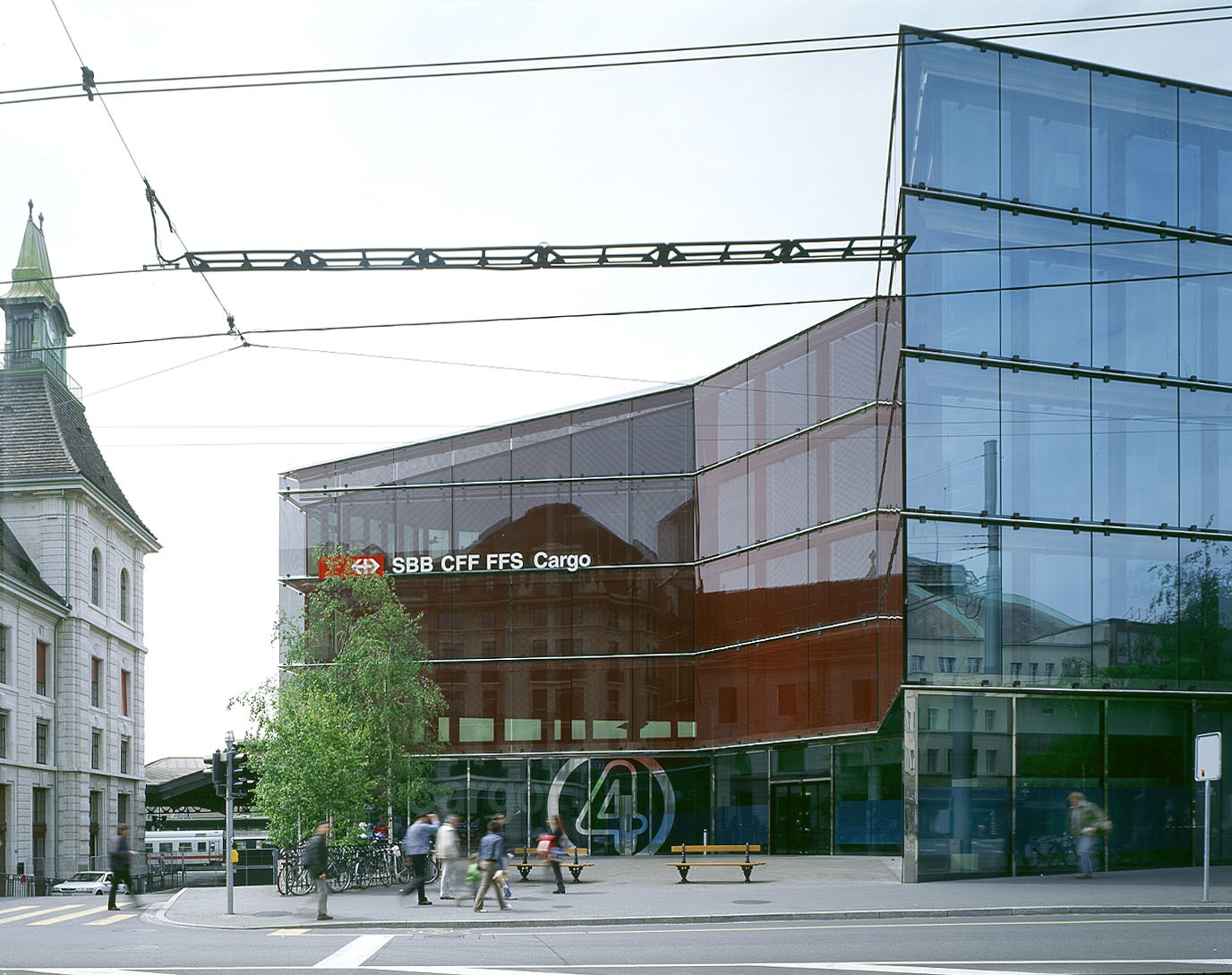 Als man Ende der achtziger Jahre einen Masterplan für das rund 1,2 Kilometer lange Gelände des schweizerischen und französischen Bahnhofs in Basel vorlegte, präsentierten der Kanton Basel- Stadt und die Schweizerischen Bundesbahnen (SBB) eine städtebauliche Entwicklungsstrategie, die auch die Westflanke des Areals mit Halle und Garage betraf. Die Halle wurde von der Denkmalpflege sorgsam beobachtet und galt als sakrosankt. Die Garage war mit ihrer eigenwilligen Typologie nicht umnutzbar und musste dem ersten Haus des New Yorker Architekten Richard Meier in der Schweiz weichen (1998). Vis-à-vis von Meiers «White Plaza» hatten die Architekten Diener & Diener 1994 ein Schulungs- und Konferenzzentrum einweihen können. Für den unternutzten Teil der französischen Bahnhofsanlage lobten die SBB schon in den achtziger Jahren einen Wettbewerb aus, den Herzog & de Meuron gewannen. Das Projekt blieb lange in der Schublade, doch als man 2001 mit dem Bau der benachbarten Bahnhofspasserelle begann, gab man in Bern auch für die Realisierung des «Elsässertors» grünes Licht. Herzog & de Meuron ergänzen nun mit ihrem soeben vollendeten neusten Schweizer Bau die Westflanke des Bahnhofs mit der kühlen Eleganz eines Glasriegels zu einem imponierenden Architekturquadrat.