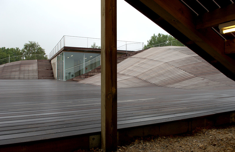 Während für das Jugendhaus möglichst viel Spielflächen im Freien errichtet werden sollten, wünschten sich die Mitglieder des Segelclubs Platz, um ihre Boote unterzubringen. Das fertige Deck stellt nun die direkte Umsetzung dieser Vorgaben dar. Wo es sich aufwölbt, können unterhalb Boote eingestellt werden, zugleich ist seine Oberfläche abwechslungsreicher und vielfältiger Spielplatz für die Jugendlichen.