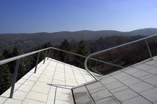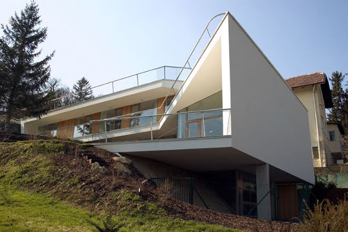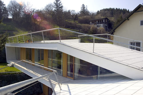 Früher stand hier ein altes Haus, die xarchitekten legten drei Konzeptmodelle mit und ohne integrierten Bestand vor: davon unbelastet, wollten die Bauherren dezidiert einen zukunftsorientierten Kontrapunkt ins geschichtsgezeichnete Weidling setzen. Hell, großzügig, in einer zweiten Phase mit Pool und Saunalandschaft am Dach ausbaubar, sollte das neue Lebensdomizil den Kärntnern bieten, was sie im Osten so vermissen: Sonne und Wasser. Blickgeschützt wollten sie mit viel Panorama naturnah wohnen, Wohnund Essbereich sollten differenziert offen, der Schlaftrakt familienwachstumskompatibel sein, ihre Bilder von diversen Fernreisen prominent platziert anhaltend gute Laune verbreiten. Mit der leichten Eleganz eines Papierfliegers setzt die raffiniert geknickte Hausraumfaltung der xarchitekten sanft am Osthang auf, auf jeder Ebene fängt ihr Inneres mit Terrassen und Balkonen die Landschaft ein. Zum sehnsüchtigen Südspitz zulaufend, reckt sich die Dachterrasse mit der zarten Metallbrüstung dem Himmel entgegen, entrollt sich nach einer Kehrtwendung sanft bergend überm Schlaftrakt, um dann am Moos aufzusetzen.