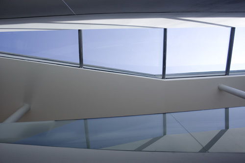 Der Spitz wird dem künftigen Pool Privatheit schenken, sein Anstieg lässt den Wohnraum darunter zu luxuriöser Höhe anwachsen, vergrößert das Panorama am schräggestellten Südglas. Seine auf die weitergeführte Ostwand zulaufende Auskragung schafft der Terrasse einen schattigen, witterungsgeschützten Bereich von fließender Weite. Semitransparent mit Polycarbonat- Stegplatten verkleidet, hockt die Garage im Berg, unterm straßenseitig geschlossenen, auskragenden Erdgeschoss schlüpft man ins Haus. Sieben Meter hoch, oberlichtbanderhellt, fängt die weiß reflektierende Nordwand die rasch vom Hang verschluckte Westsonne ein, an ihr kommen die Bilder voll zur Geltung, ungehindert fließen von hier die zwei hellen, großen Wohnebenen in den Vorgebirgsgarten aus. Wie durch einen Felsspalt erklimmt man die Schiefertreppe dem Licht entgegen in den Raumfluss an der Glasfassade, die nur von den Holztürrahmen und einem Paneel vor der schiefergedeckten Küchenzeile unterbrochen wird. Sie schmiegt sich in den Hang und öffnet sich zur Lärchenterrasse, überm Esstisch knickt die Decke zum Wohnen hoch, das sich mit Ahornboden über-eck-verglast einen Treppensprung tiefer dem südspitzumhausten, steingedeckten Terrassenende zuwendet.
